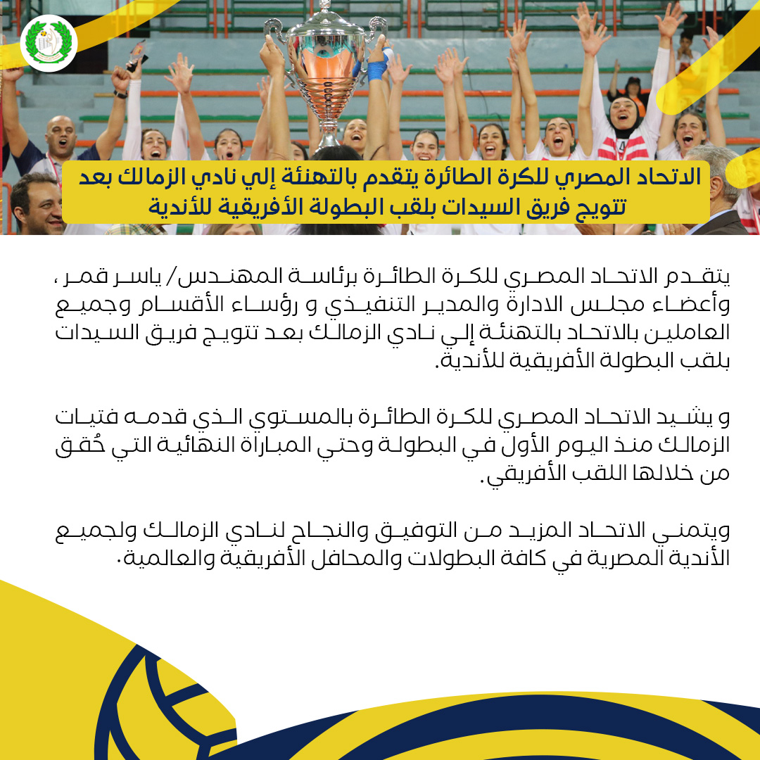ووجه الاتحاد المصري للكرة الطائرة التهنئة للفريق، في بيان له عبر الصحفة الرسمية، قائلا: يتقدم الاتحاد المصري للكرة الطائرة برئاسة المهندس ياسر قمر، وأعضاء مجلس الإدارة والمدير التنفيذي ورؤساء الأقسام وجميع العاملين بالاتحاد بالتهنئة إلى نادي الزمالك بعد تتويج فريق السيدات بلقب البطولة الإفريقية للأندية.