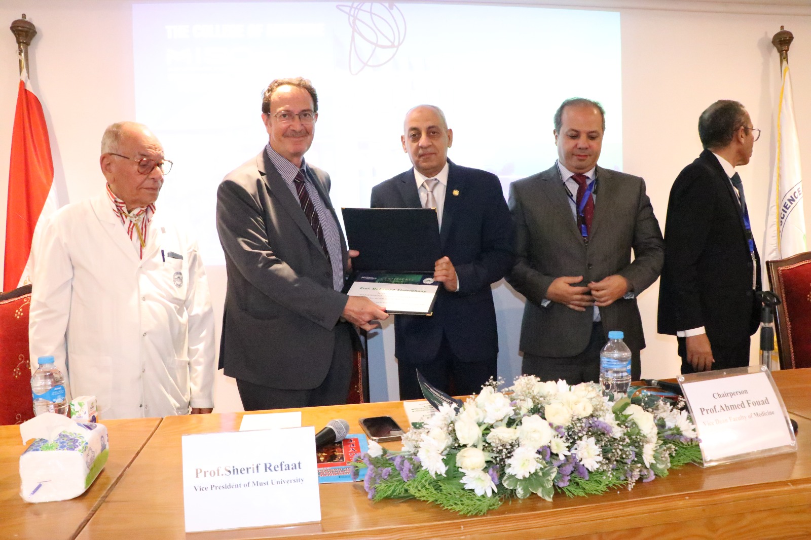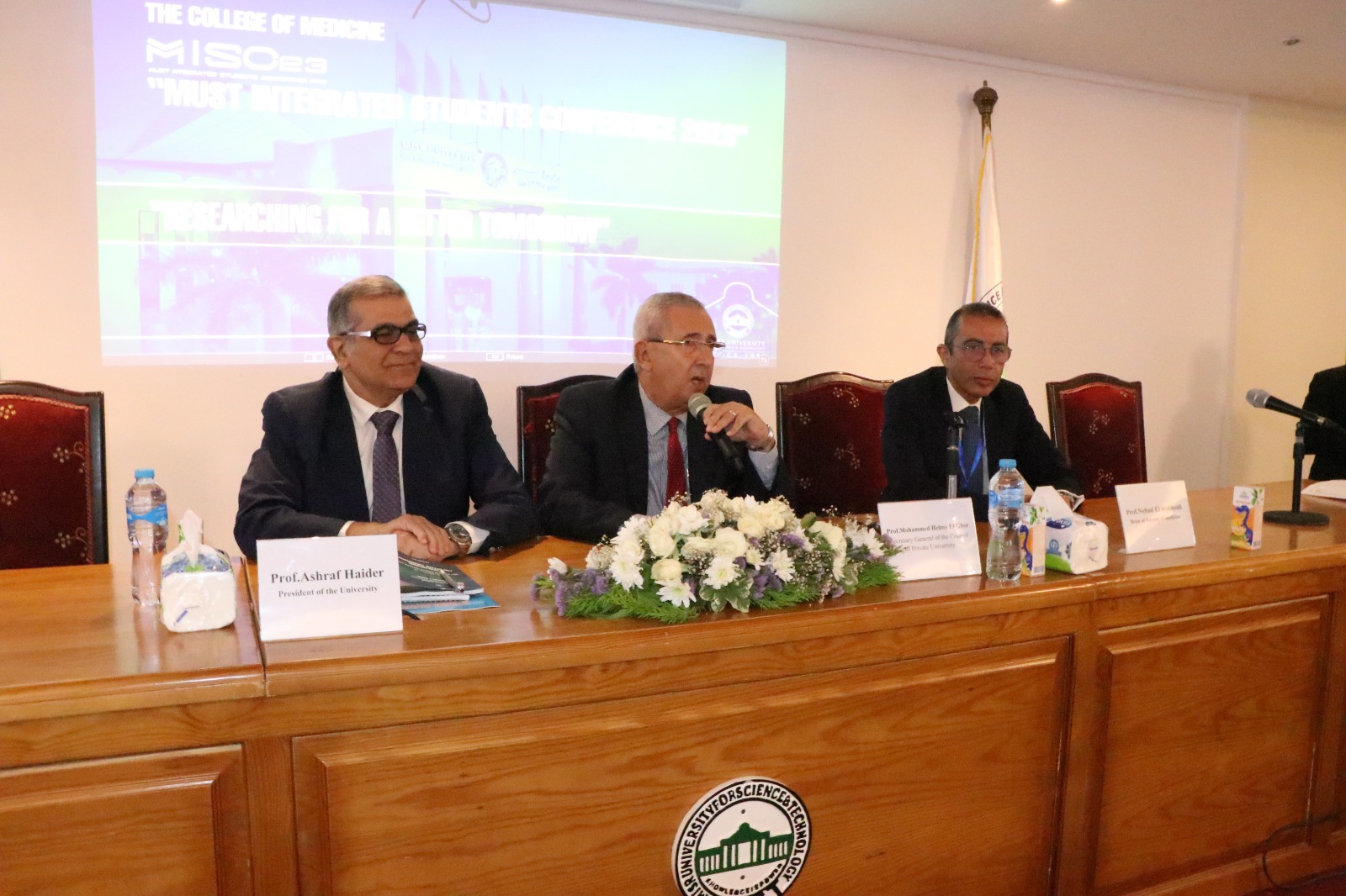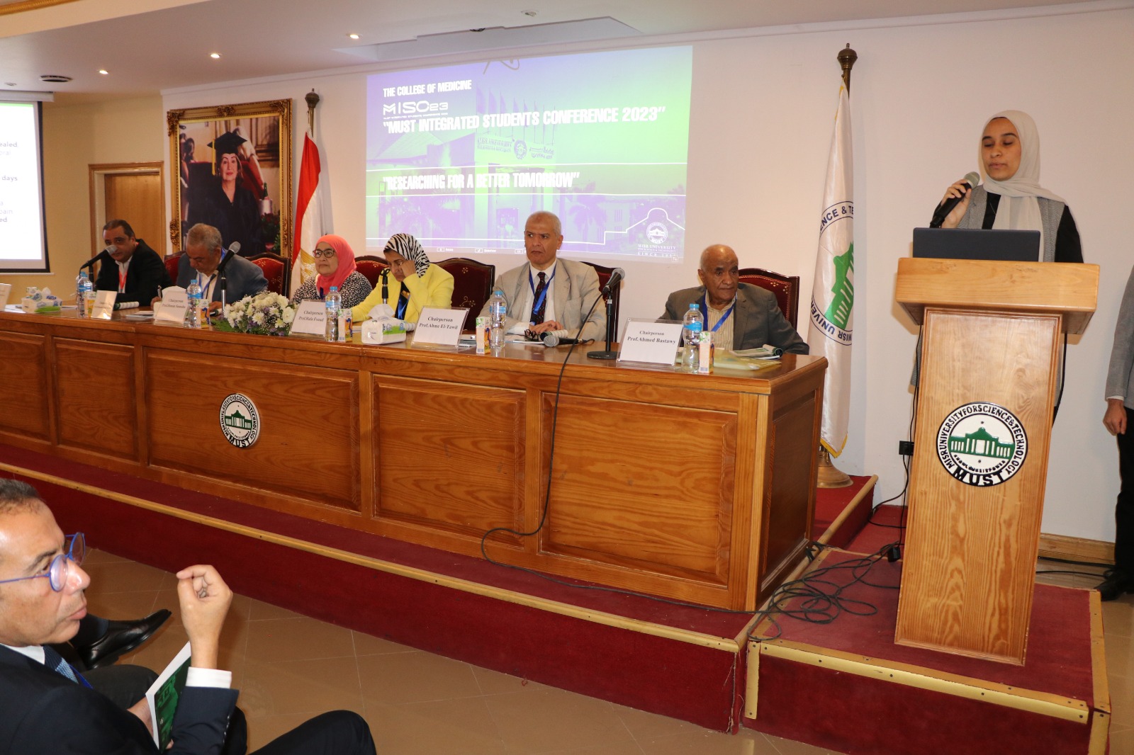 عقدت كلية الطب جامعة مصر للعلوم والتكنولوجيا المؤتمر البحثي الطلابي الأول للنظام التكاملي الحديث ( 5+2 ) MISC 23، تحت شعار "البحث العلمي من أجل غد أفضل"، وذلك برعاية خالد الطوخي رئيس مجلس أمناء جامعة مصر للعلوم والتكنولوجيا، والدكتور أشرف حيدر غالب القائم بأعمال رئيس الجامعة، وبحضور الدكتور محمد حلمي الغر أمين عام المجلس الأعلى للجامعات الخاصة والأهلية، والدكتور شريف رفعت نائب رئيس الجامعة لشئون التعليم والطلاب، وعميد كلية الطب البشري الدكتور نهاد المحبوب ووكيل الكلية لشئون التعليم والطلاب الدكتور نانسي زغلول ووكيل الكلية لخدمة المجتمع الدكتور أحمد فؤاد، ورئيس المؤتمر الدكتور محمود طنطاوي.