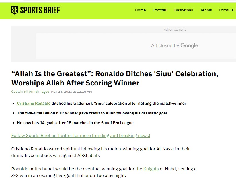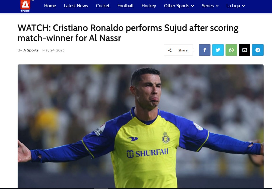 عنونت الشبكة في تقريرها، بـ كريستيانو رونالدو يسجد بعد هدفه الرائع مع النصر.