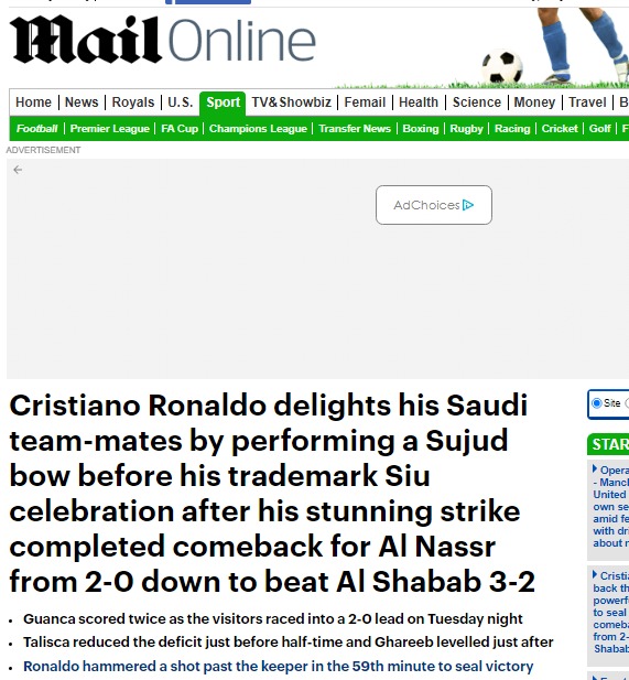 وقالت صحيفة ديلي ميل، إن رونالدو أسعد زملاءه بعد أن سجد عقب هدفه مع النصر ثم أدى احتفاله الشهير SIU خلال ريمونتادا الفريق على الشباب بنتيجة 3-2.