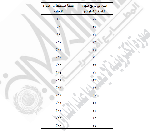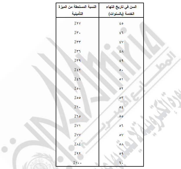 وتضمنت نصوص المادة الأولى، أنه في حالة انتهاء خدمة العاملين بسبب الاستقالة أو النقل إلى جهـة أخرى أو الإحالة إلى المعاش المبكر أو صدور قرار سيادي بانتهاء خدمة العـضو مـن الجهـة سواء بناءا على رغبة العضو أو بدون رغبته أو الفصل لغير الأسباب التأديبية، يؤدي الصندوق للعضو ميزة تأمينية طبقً ا لما ورد بالمادة 7 / أولًا، ثـم تـصرف طبقًا للجدول التالي: