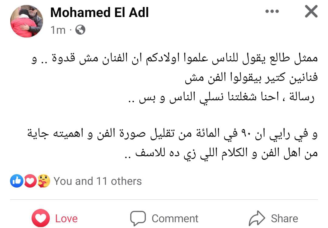 وكتبت ماندو العدل رسالة عبر حسابه الشخصي بموقع فيسبوك جاء فيها: ممثل طالع يقول للناس علموا أولادكم إن الفنان مش قدوة، وفنانين كتير بيقولوا الفن مش رسالة، إحنا شغلتنا نسلي الناس وبس.