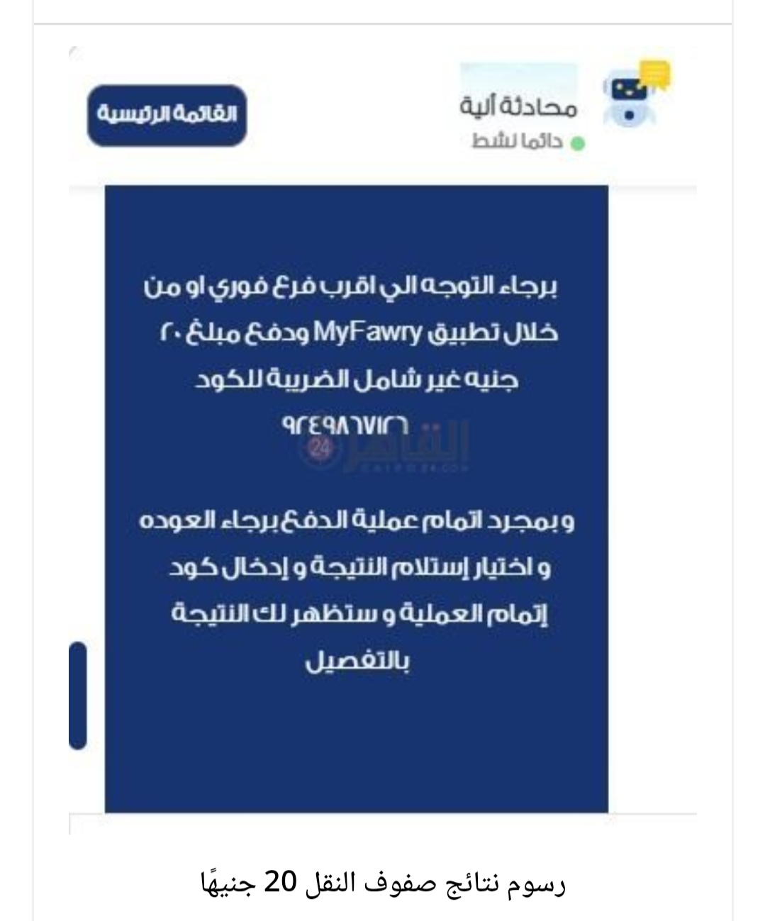 يمكن الحصول على نتائج صفوف النقل عن طريق المحادثة الآلية للبوابة الإلكترونية لمحافظة القاهرة كالآتي: