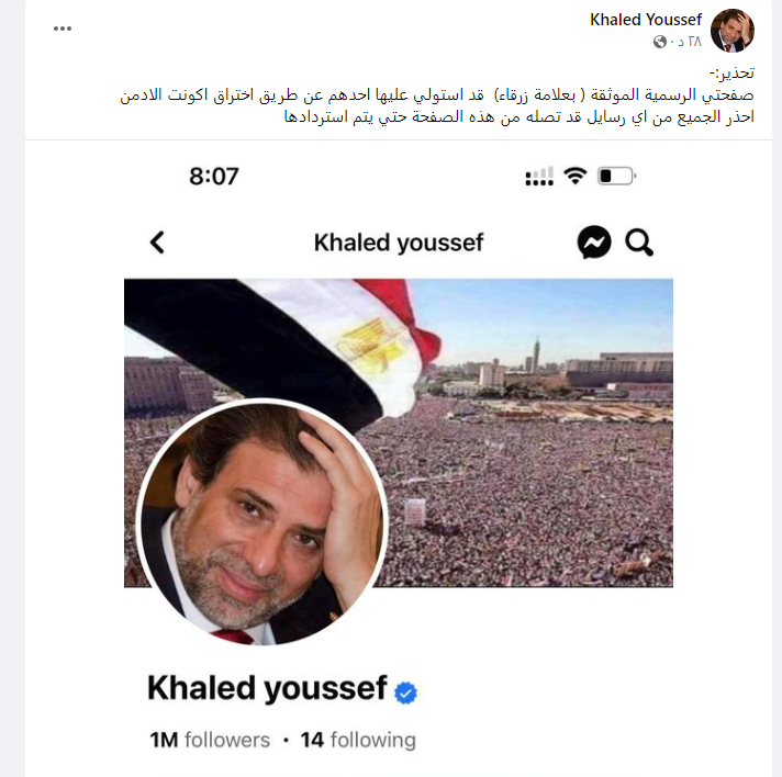 وذكر المخرج خالد يوسف: تحذير، صفحتي الرسمية الموثقة بعلامة زرقاء قد استولى عليها أحدهم عن طريق اختراق أكونت الأدمن، مضيفًا: أحذر الجميع من أي رسائل قد تصله من هذه الصفحة حتي يتم استردادها.