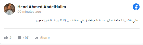 وكتبت هند عبد الحليم، منشورًا عبر حسابها الشخصي بموقع فيسبوك، أعلنت من خلاله خبر الوفاة، قائلة: عمتي الكبيرة آمال عبد الحليم الطيار، في ذمة الله، إنا لله وأنا إليه راجعون.