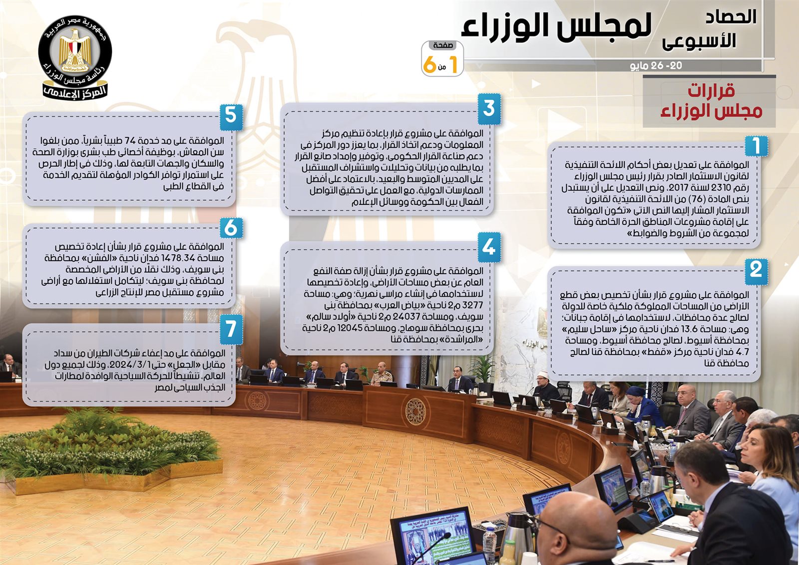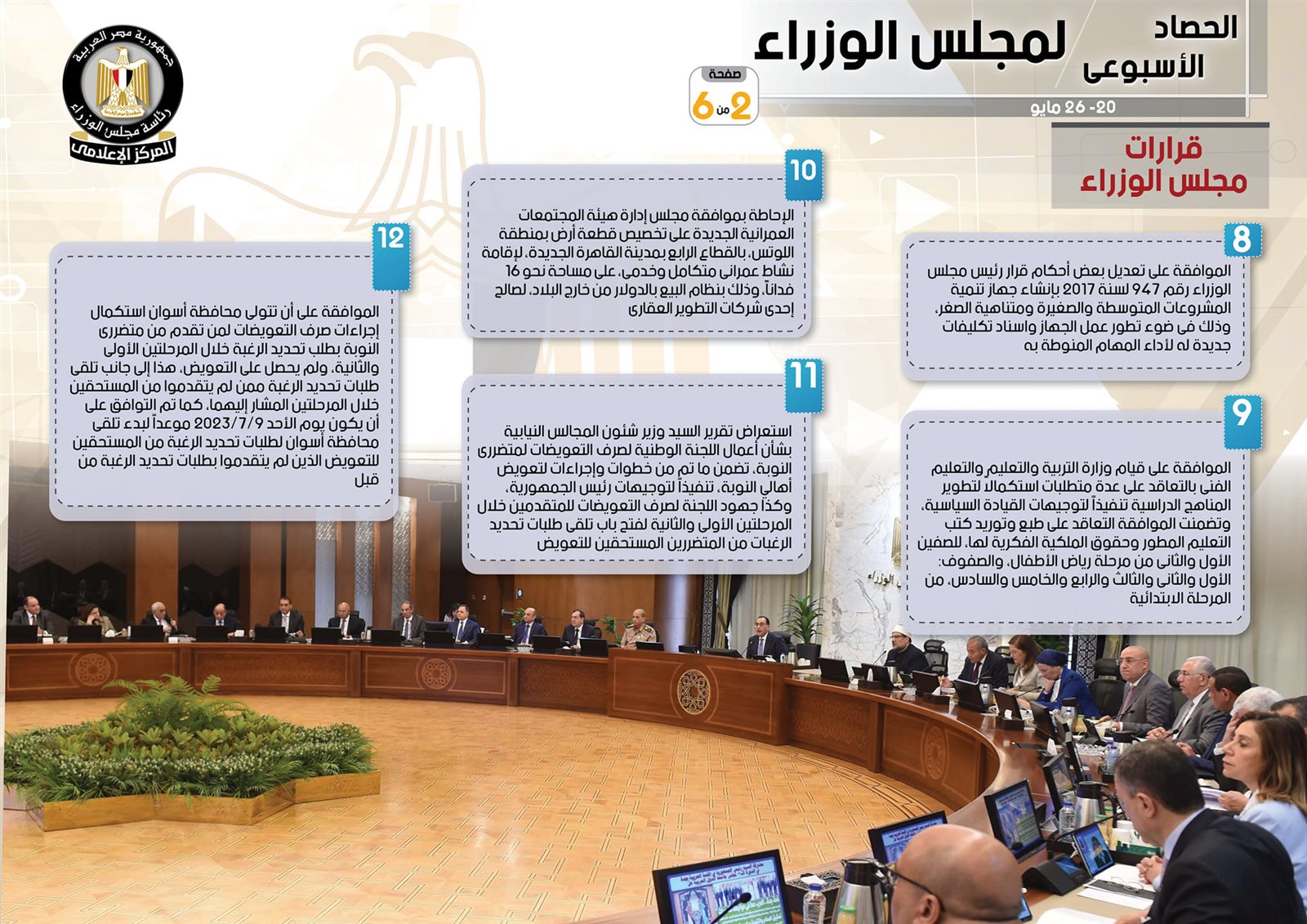 الحصاد الأسبوعي لمجلس الوزراء خلال الفترة من 20 حتى 26 مايو 2023
