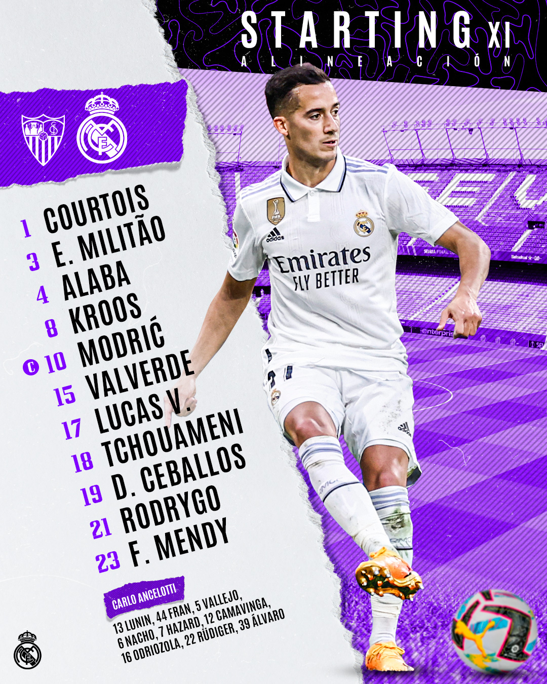 قرر كارلو أنشيلوتي، مدرب ريال مدريد، أن يدخل مباراة فريقه أمام فريق إشبيلية في مسابقة الدوري الإسباني، بتشكيل مكون من: -