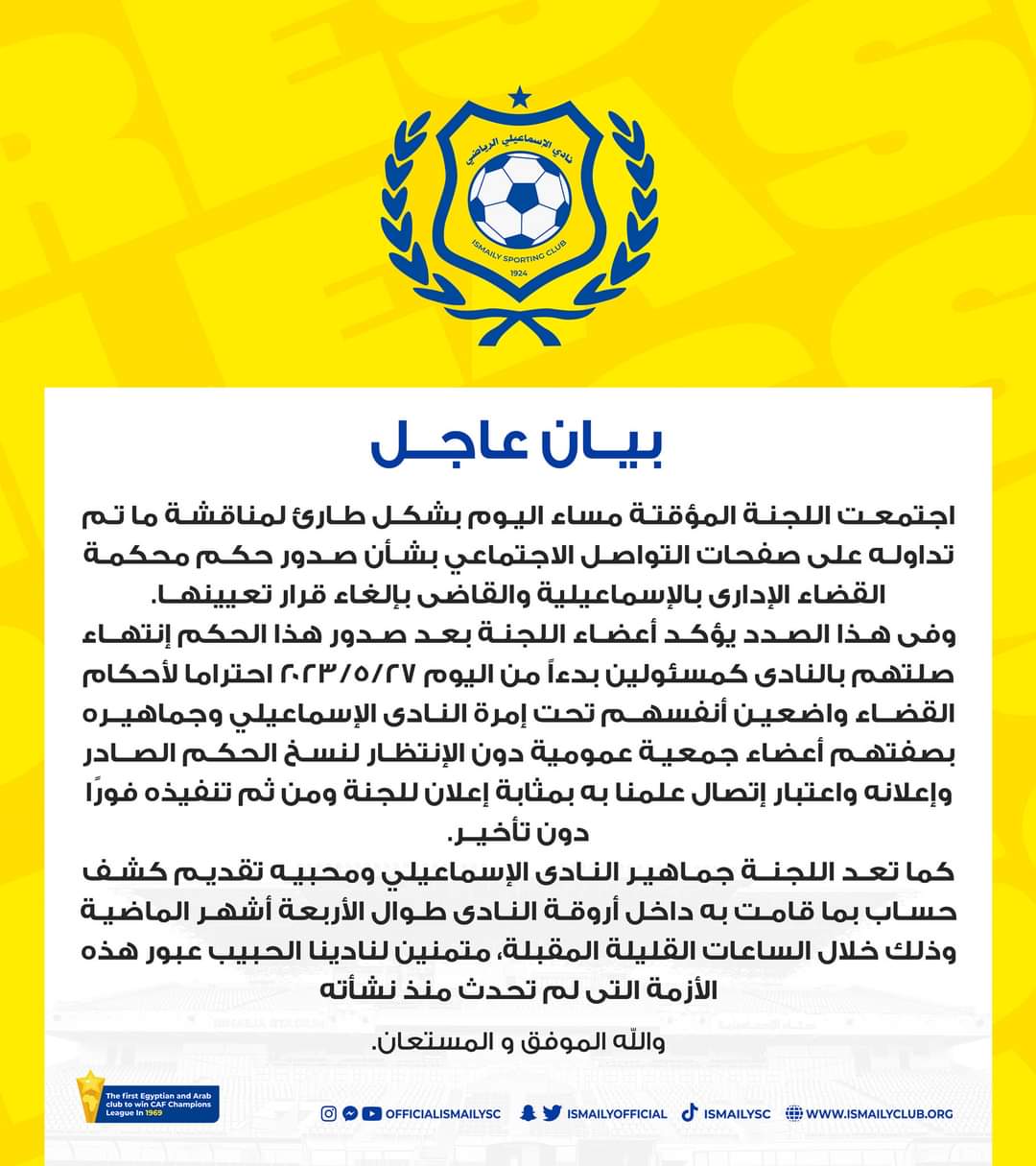 وأعلن الإسماعيلي في بيان رسمي: يؤكد أعضاء اللجنة بعد صدور هذا الحكم انتهاء صلتهم بالنادي كمسئولين بدءًا من اليوم 2023/5/27 احتراما لأحكام القضاء واضعين أنفسهم تحت إمرة النادي الإسماعيلي وجماهيره بصفتهم أعضاء جمعية عمومية دون الانتظار لنسخ الحكم الصادر وإعلانه، واعتبار اتصال علمنا به بمثابة إعلان للجنة ومن ثم تنفيذه فورًا دون تأخير.