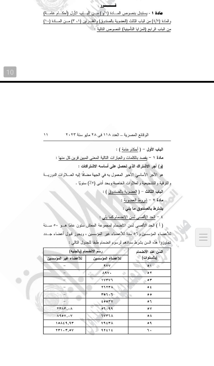 ونص القرار على أن يستبدل بنصوص المادة (1/و) من الباب الأول (الحكام عامة) والمادة (7/4) من الباب الثالث (العضوية بالصندوق) والفقرتين (٣،١) من المادة (١٠) من الباب الرابع (المزايا التأمينية) النصوص التالية: