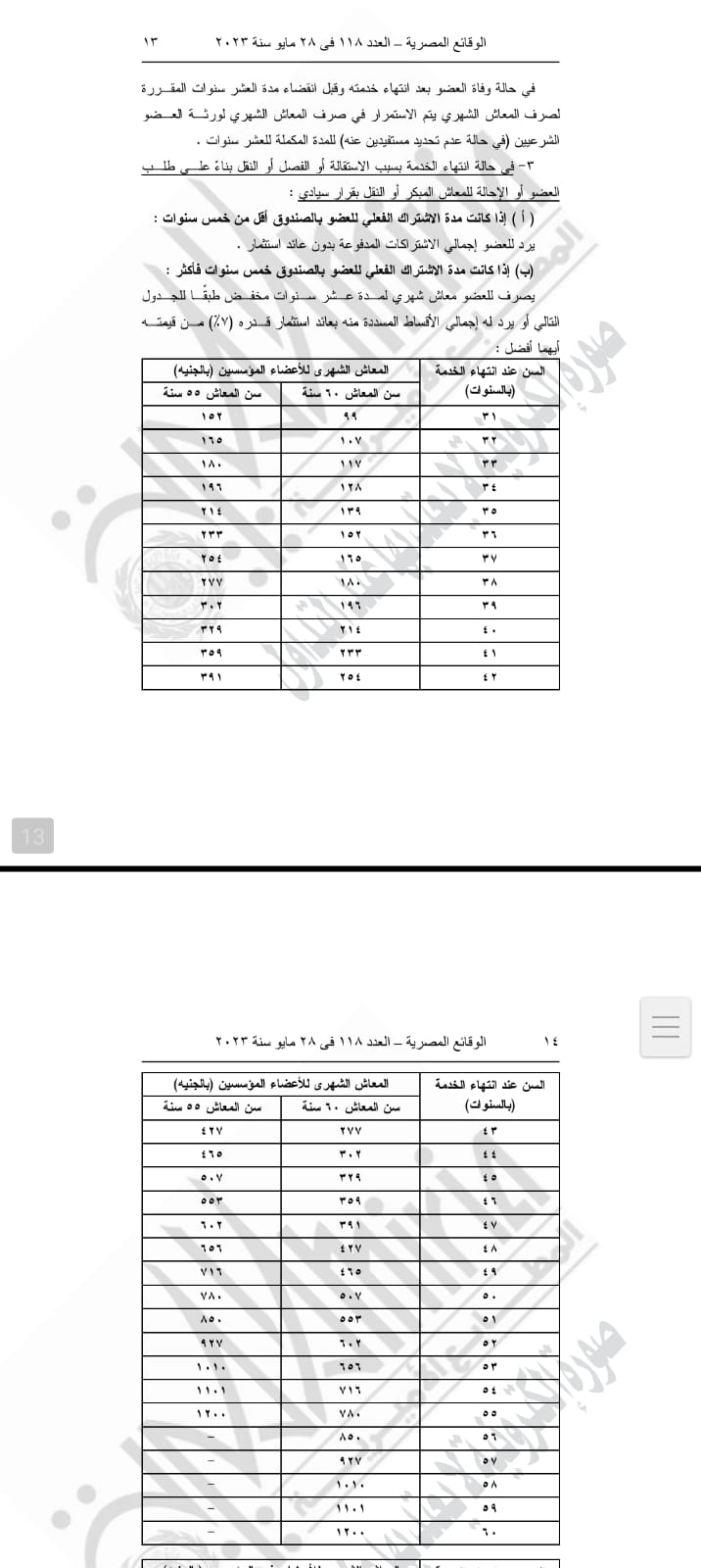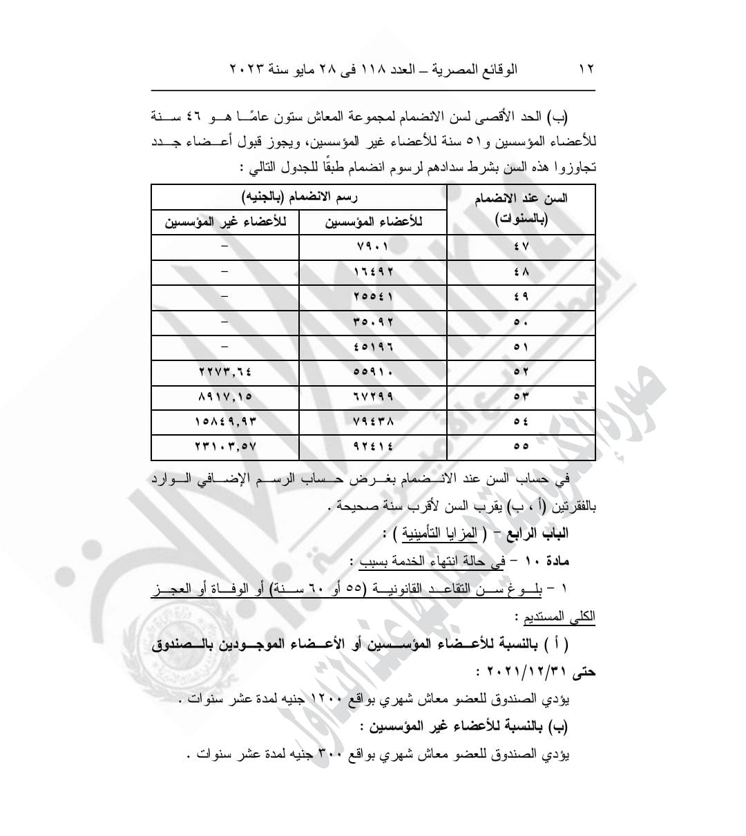 -الحد الأقصى لمن الانضمام لمجموعة المعاش ستون عاما هو ٥٠ سنة للأعضاء المؤسسين و٥٦ سنة للأعضاء غير المؤسسين، ويجوز قبول أعضاء جدد تجاوزوا هذه السن بشرط سدادهم لرسوم انضمام طبقا للجدول التالي: