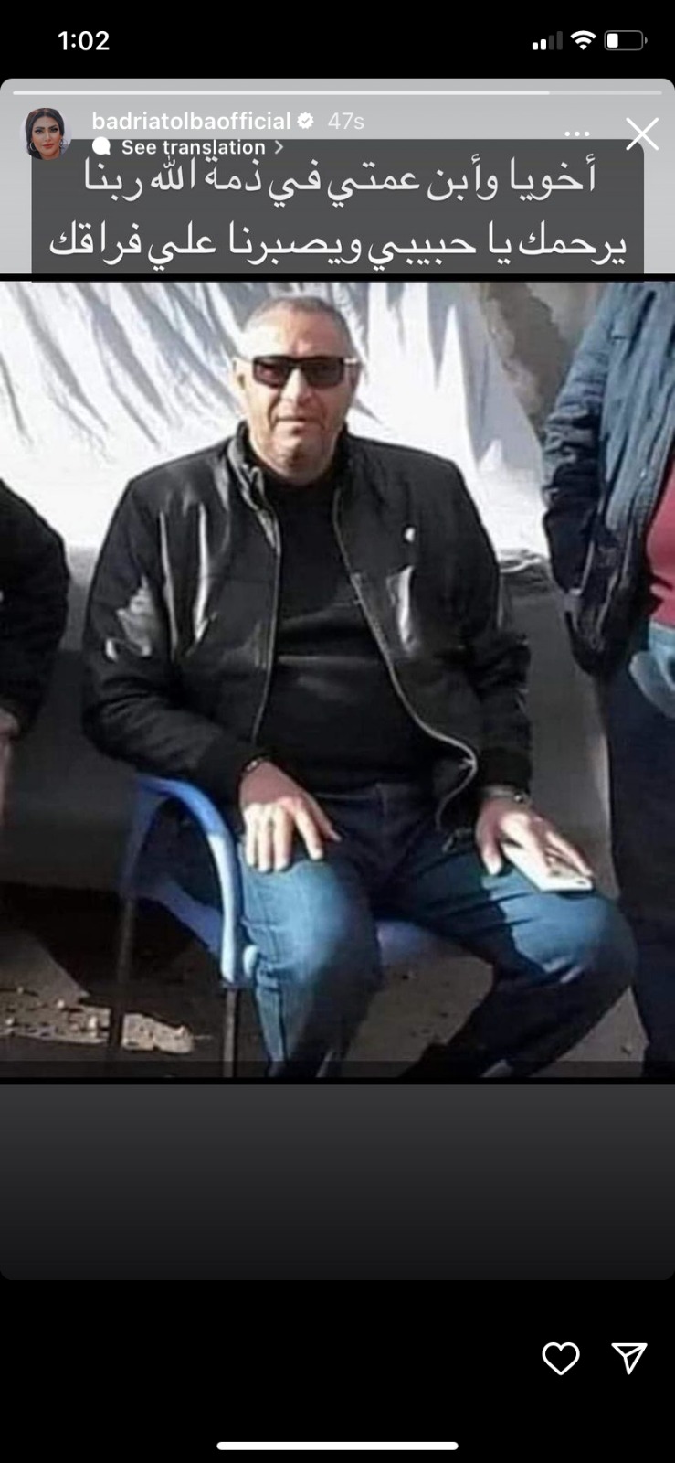 ونشرت بدرية طلبة صورة نجل عمتها من خلال ستوري عبر حسابها الشخصي على انستجرام، وعلقت عليها قائلةً: أخويا وابن عمتي في ذمة الله ربنا يرحمك يا حبيبي ويصبرنا على فراقك.