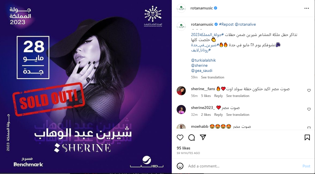 من جانبها، أعلنت شركة روتانا للإنتاج الفني والموسيقي، نفاذ تذاكر حفل المطربة شيرين عبد الوهاب، وذلك من خلال نشرها بوستر حفل المطربة شيرين عبد الوهاب في المملكة العربية السعودية، عبر حسابها الشخصي على موقع تبادل الصور والفيديوهات انستجرام.