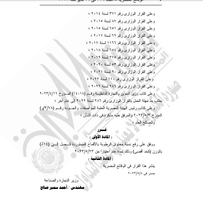 وأوضح قرار نشرته الجريدة صباح اليوم الاثنين 29 مايو 2023، أن قرار وزارة الصناعة جاء بناء على كتاب وزير التموين على المصيلحي مؤرخ بـ16 إبريل 2023، وبعد موافقة هيئة المواصفات والجودة بتاريخ 3 مايو 2023.
