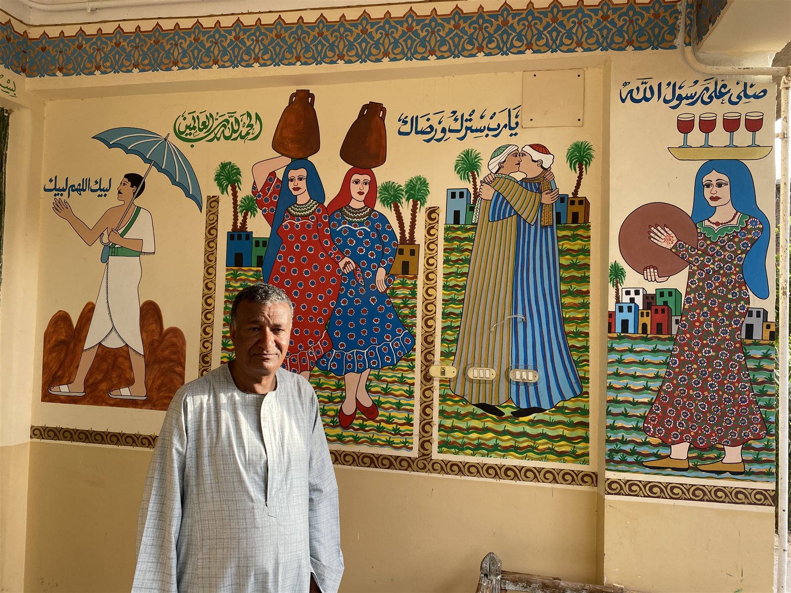 يمسك فرشاته وألوانه فيحيل الجدران الصماء بالألوان الزاهية إلى لوحات ناطقة بالفرحة والبهجة والجمال برسومات من الفن الشعبي الصعيدي الأصيل، تماما كما وجد أجداده المصريين القدماء نقشوا وزينوا الحجر على جدران المعابد والمقابر بالأقصر.