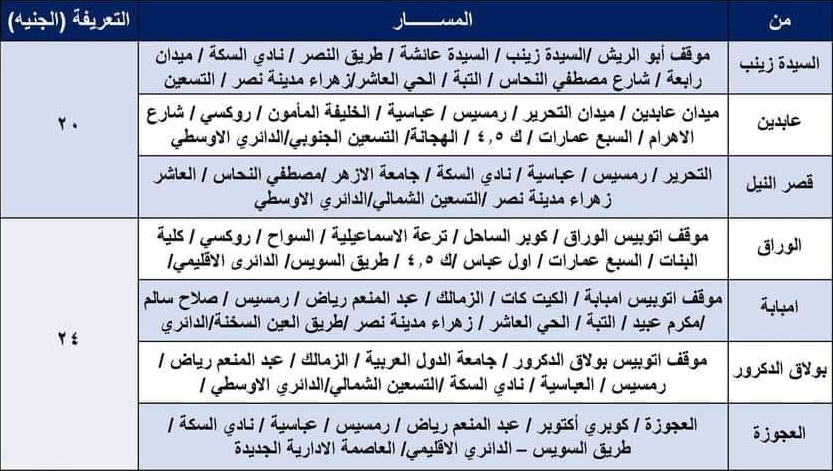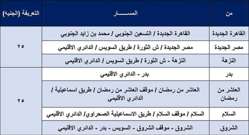 وأضافت وزارة النقل في منشور لها عبر صفحتها الرسمية بـ فيسبوك، أن تعريفة ركوب السيارة يبدأ من 18 جنيها ويصل في بعض الأحيان إلى 45 جنيها طبقا لطول المسافة، وتبدأ مواعيد التشغيل من الساعة 6 صباحا وحتى الساعة 12 منتصف الليل.