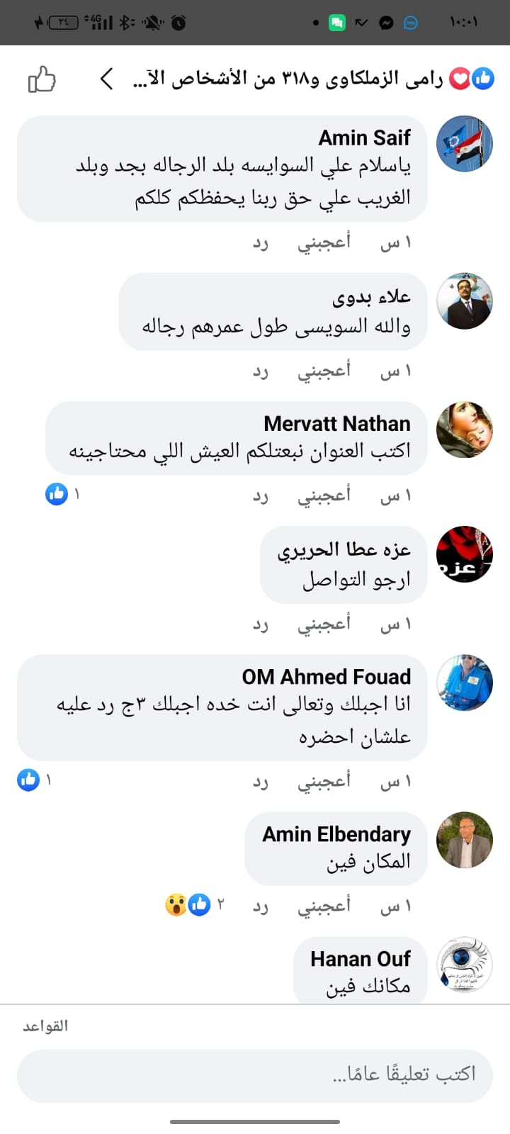 وكتب حساب باسم محمد البدري: "عرفوني مكانكم فين أنا في السلام بجوار فرن أشرف"، وكتب حساب باسم علا أحمد: "فين مكانك ابعتلك العيش لغاية عندك، وشوف لو عاوزين هدومكم للغسيل ابعتلي رسالة، وأنا هتواصل معاكم ربنا يجبر خاطركم يارب".