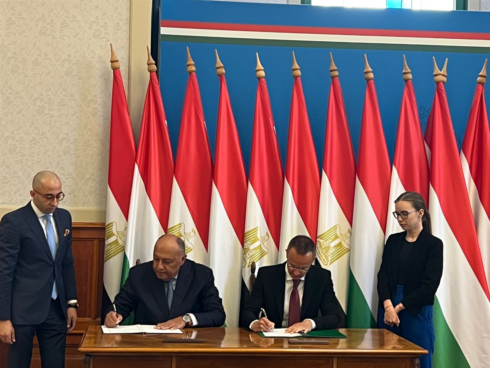 ومن جانبه، أعرب وزير الخارجية والتجارة المجري عن التشرف بزيارة وزير الخارجية والتي تتزامن مع الاحتفال بمرور 95 عامًا على العلاقات الدبلوماسية بين مصر والمجر. كما ثمن الوزير المجري عاليًا موقف مصر في التعامل مع قضية الهجرة غير الشرعية، لاسيما مع احتدام الأزمة الحالية التي يشهدها السودان، داعيًا الاتحاد الأوروبي إلى زيادة دعم مصر للتعامل مع تبعات تلك الأزمة. كما تناول الوزير المجري التعاون المطرد بين مصر والمجر فى العديد من المجالات.