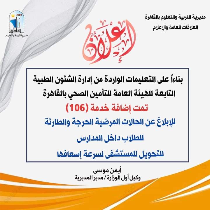 أعلن أيمن موسى، مدير مديرية التربية والتعليم والتعليم الفني بمحافظة القاهرة، إضافة خدمة 106 للإبلاغ عن الحالات المرضية والحرجة والطارئة للطلاب داخل المدارس للتحويل إلى المستشفى لسرعة إسعافها.