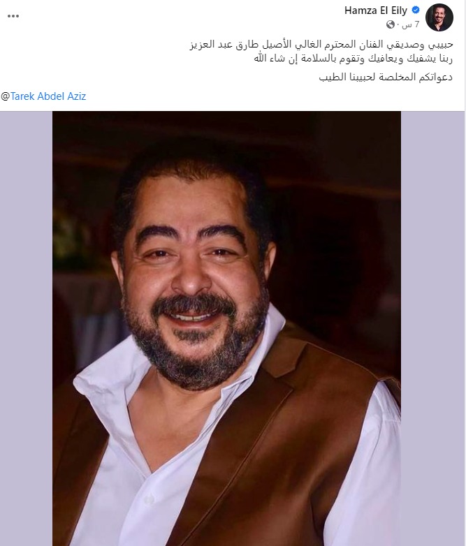 ونشر حمزة العيلي، صورة لـ طارق عبد العزيز، عبر حسابه الشخصي بموقع فيس بوك، وعلق عليها قائلًا: حبيبي وصديقي الفنان المحترم الغالي الأصيل طارق عبد العزيز، ربنا يشفيك ويعافيك وتقوم بالسلامة يارب، دعواتكم المخلصة لحبيبنا الطيب.