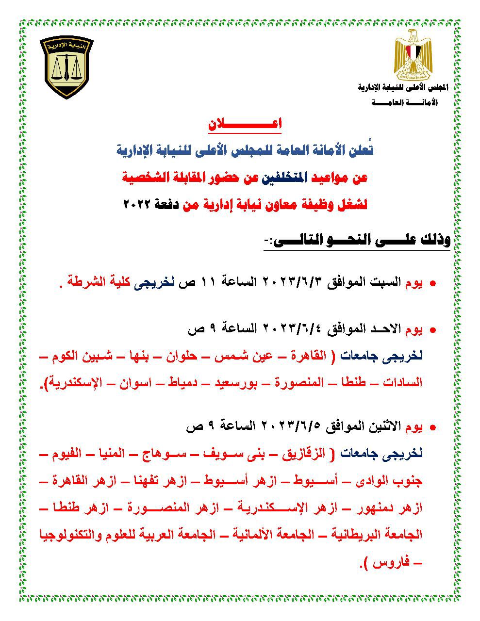 أعلنت هيئة النيابة الإدارية أمس عن مواعيد المتخلفين عن حضور المقابلة الشخصية لشغل وظيفة معاون نيابة إدارية من دفعة 2022.