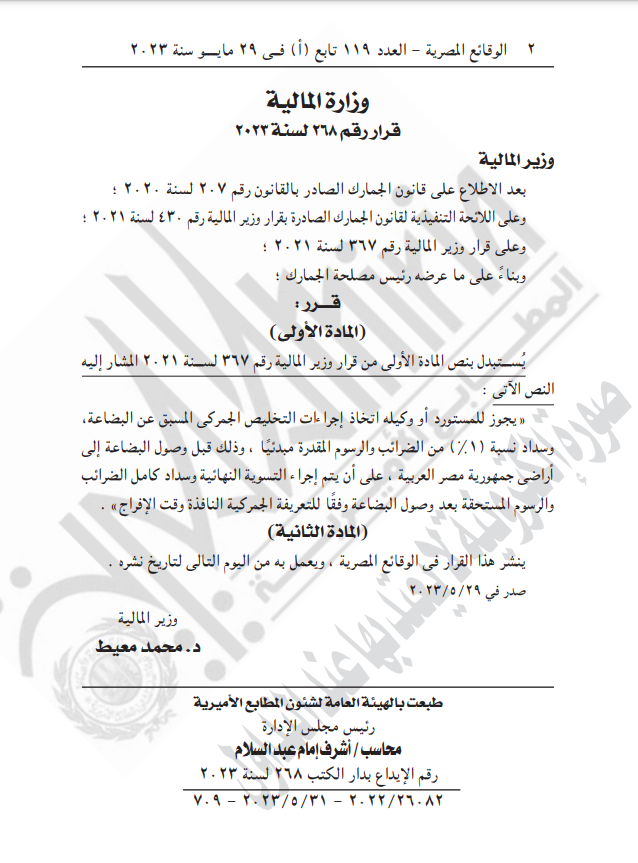 نشرت الجريدة الرسمية قرار الدكتور محمد معيط وزير المالية رقم 268 لسنة 2023 بشأن تسهيل إجراءات التخلص الجمركي المسبق عن البضائع المستوردة، من خلال السماح لهم بسداد جزء من الضرائب والرسوم المقدرة بشكل مبدئي قبل وصول البضائع من الخارج.