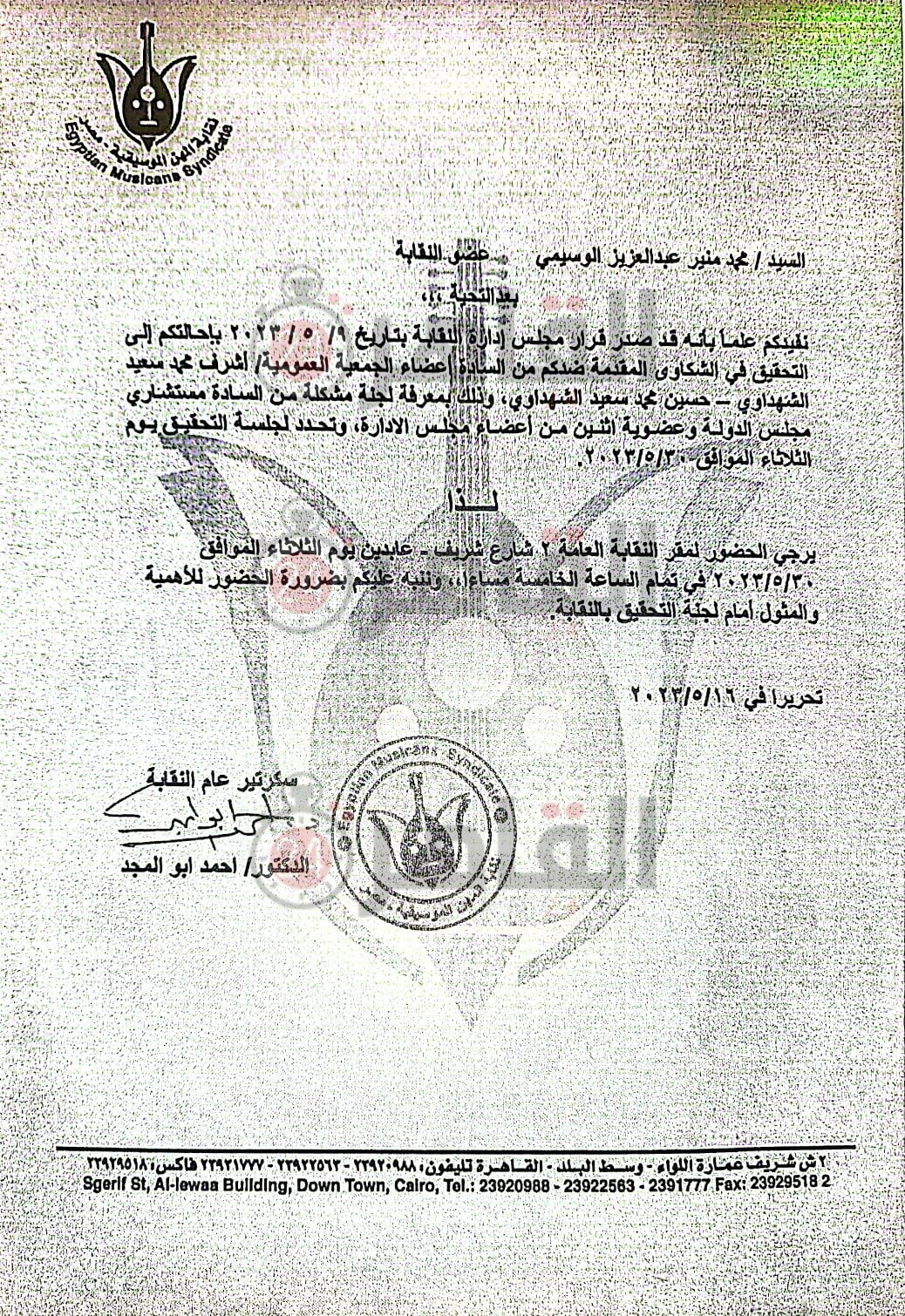 وحصل القاهرة 24 على مستند إحالة منير الوسيمي للتحقيق بسبب شكاوى مقدمة ضده، والذي ينص على الآتي: نفيدكم علمًا بأنه قد صدر قرار مجلس إدارة النقابة بتاريخ 9 مايو 2023 بإحالتكم للتحقيق في الشكاوى المقدمة ضدكم من السادة أعضاء الجمعية العمومية أشرف محمد سعيد الشهداوي وحسين محمد سعيد الشهداوي، وذلك بمعرفة لجنة مشكلة من السادة مستشاري مجلس الدولة وعضوية اثنين من أعضاء مجلس الإدارة، وتحدد لجلسة التحقيق يوم الثلاثاء 30 مايو عام 2023.