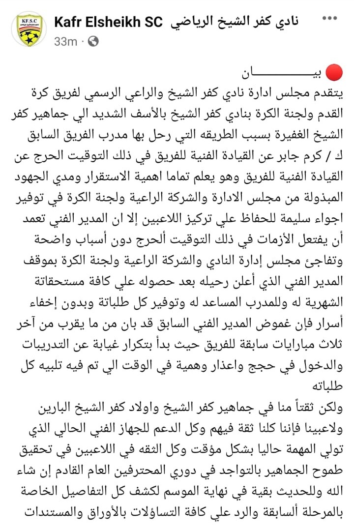 يتقدم مجلس إدارة نادي كفر الشيخ والراعي الرسمي لفريق كرة القدم ولجنة الكرة بنادي كفر الشيخ، بالأسف الشديد إلى جماهير كفر الشيخ الغفيرة بسبب الطريقة التي رحل بها مدرب الفريق السابق الكابتن كرم جابر عن القيادة الفنية للفريق، في ذلك التوقيت الحرج، وهو يعلم تماما أهمية الاستقرار ومدى الجهود المبذولة من مجلس الإدارة والشركة الراعية ولجنة الكرة في توفير أجواء سليمة؛ للحفاظ على تركيز اللاعبين.