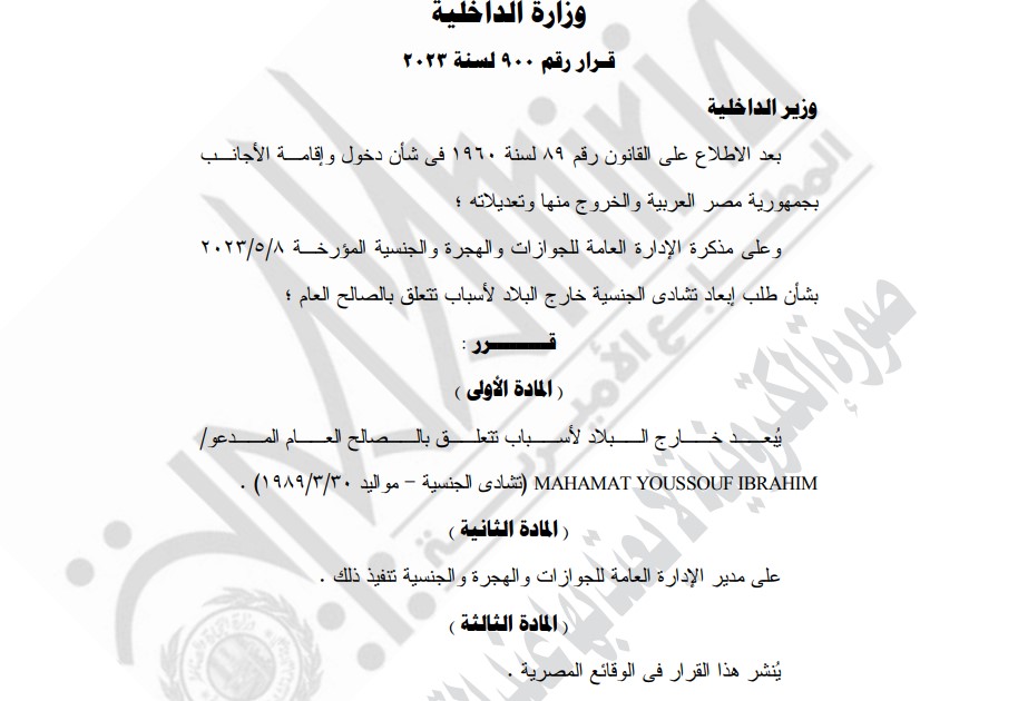 نشرت الجريدة الرسمية قرار اللواء محمود توفيق وزير الداخلية رقم 900 لسنة 2023، الذي ينص على إبعاد تشادي الجنسية خارج البلاد لأسباب تتعلق بالصالح العام.