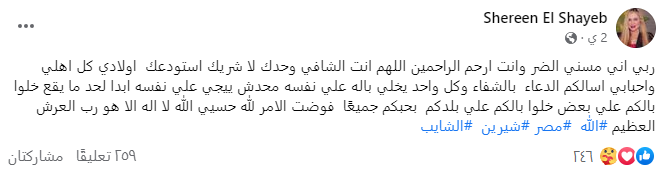 ومن جانبها، كانت طلبت شيرين الشايب، الدعاء من جميع محبيها ومتابعيها، إذ قالت في منشور لها عبر حسابها الشخصي بـ موقع التواصل الاجتماعي فيس بوك: ربي إني مسني الضر وأنت أرحم الراحمين، اللهم أنت الشافي وحدك لا شريك، أستودعك أولادي كل أهلي وأحبابي.. اسالكم الدعاء بالشفاء.