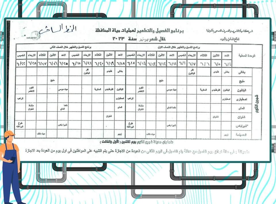 وأكد على التنسيق الكامل بين فروع الشركة ورؤساء الوحدات المحلية كل فى نطاقه والتأكيد بالالتزام بالجدول الزمني المحدد والمواعيد المقررة لأعمال الغسيل والتطهير بمحطات المياه والتعامل الفوري مع أى طوارئ حفاظًا على صحة المواطنين.