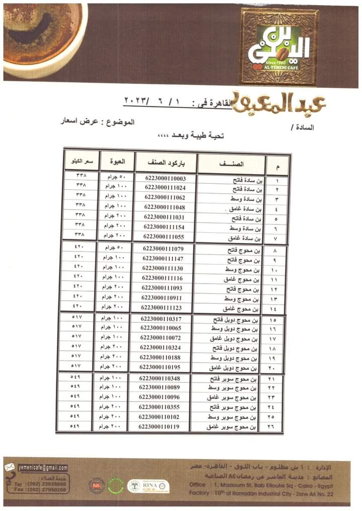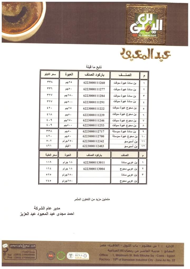ورفعت شركة عبد المعبود عربي سادة 119 جنيها للعلبة، وسعر البن العربي المحوج إلى 745 جنيها للعلبة.