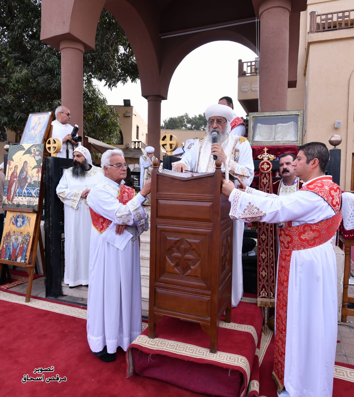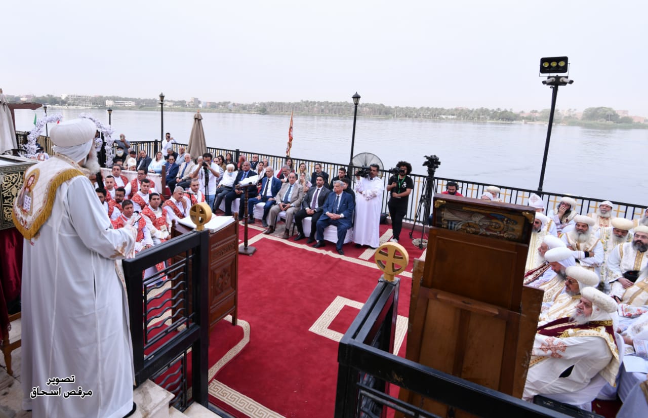 وبارك قداسة البابا مياه النيل الواقعة عليه الكنيسة، برش مياه البركة فيه، عقب انتهاء القداس الذي أقيم الهواء الطلق في المنطقة المطلة على النيل مباشرة.