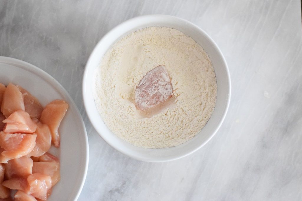 - وفي الخطوة الثالثة يتم وضع دقيق الذرة مع الفلفل الأسود، والبصل البودر، وأيضا الملح على خليط الدجاج.