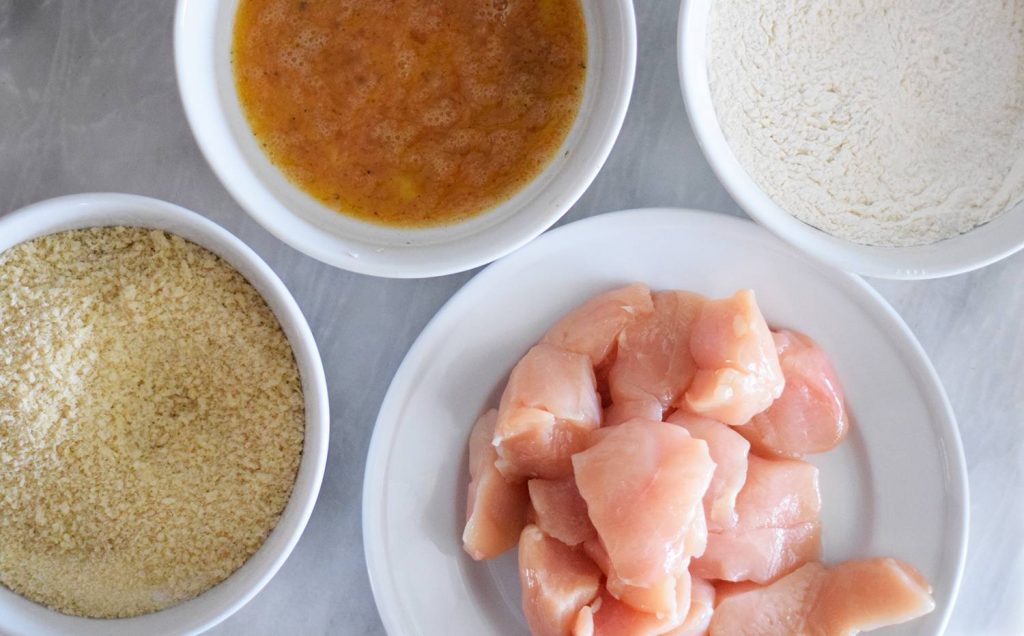 - وفي الخطوة الخامسة، يتم وضع الدقيق في طبق.. وأيضا البقمساط في طبق منفصل، بالإضافة إلى خفق البيض مع اللبن والفلفل الأسود في طبق، ثم يوضع فيه قطع الناجتس.