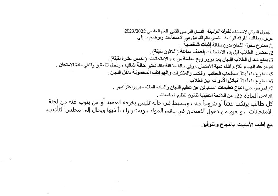 - يحب على طلاب الفرقة الرابعة الحضو قبل بدء الامتحانات بنصف ساعة.