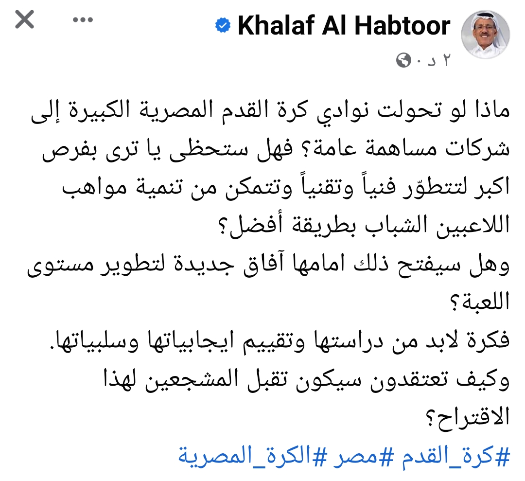 واستكمل منشوره، بسؤال آخر، هل سيفتح ذلك أمام الأندية آفاقا جديدة لتطوير مستوى اللعبة، وكيف تعتقدون سيكون تقبل المشجعين لهذا الاقتراح.