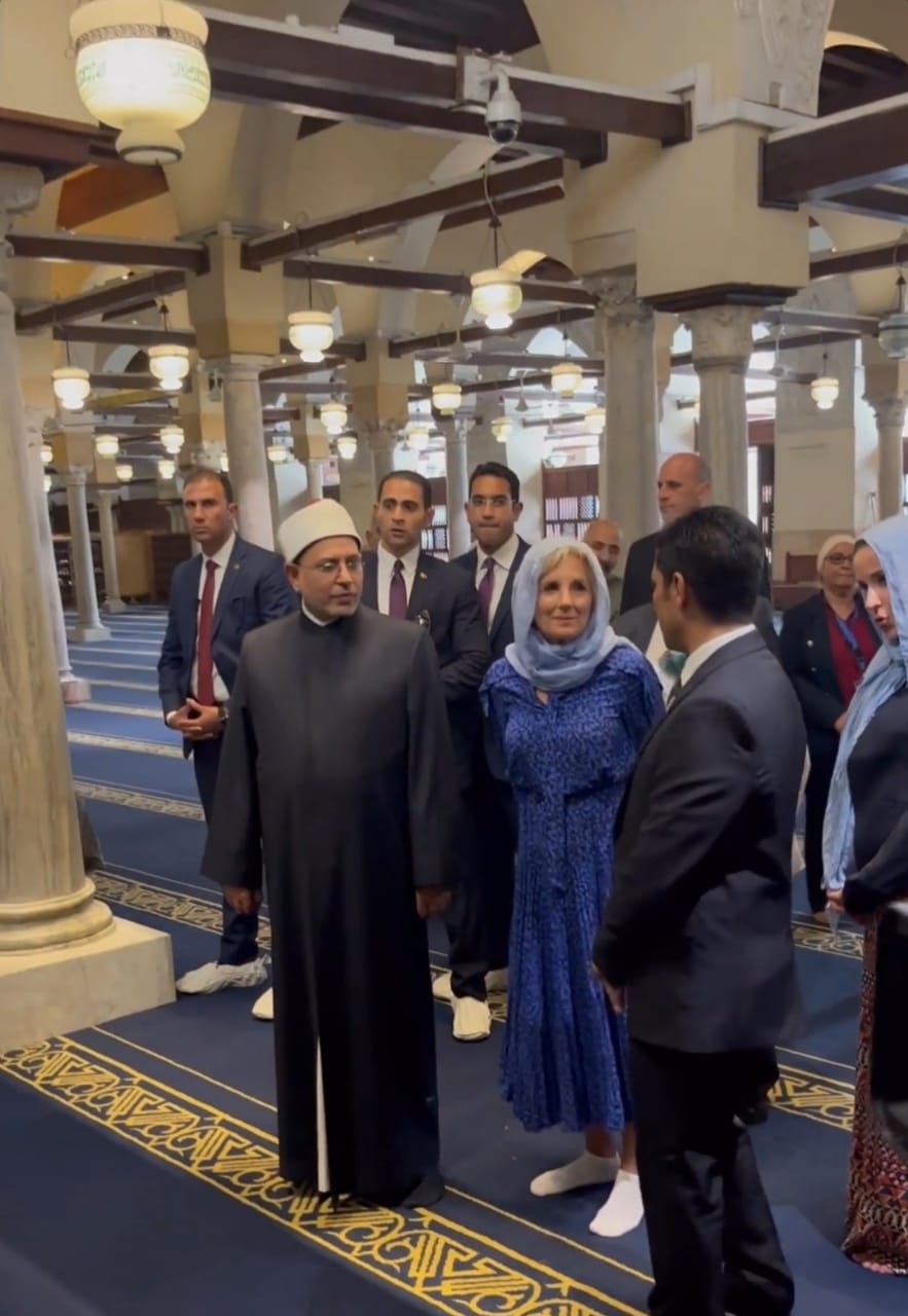 وارتدت السيدة جيل بايدن رداءًا طويل وغطاء رأس خلال الزيارة للالتزام بتقاليد الإسلام واحترام المسجد الشريف.