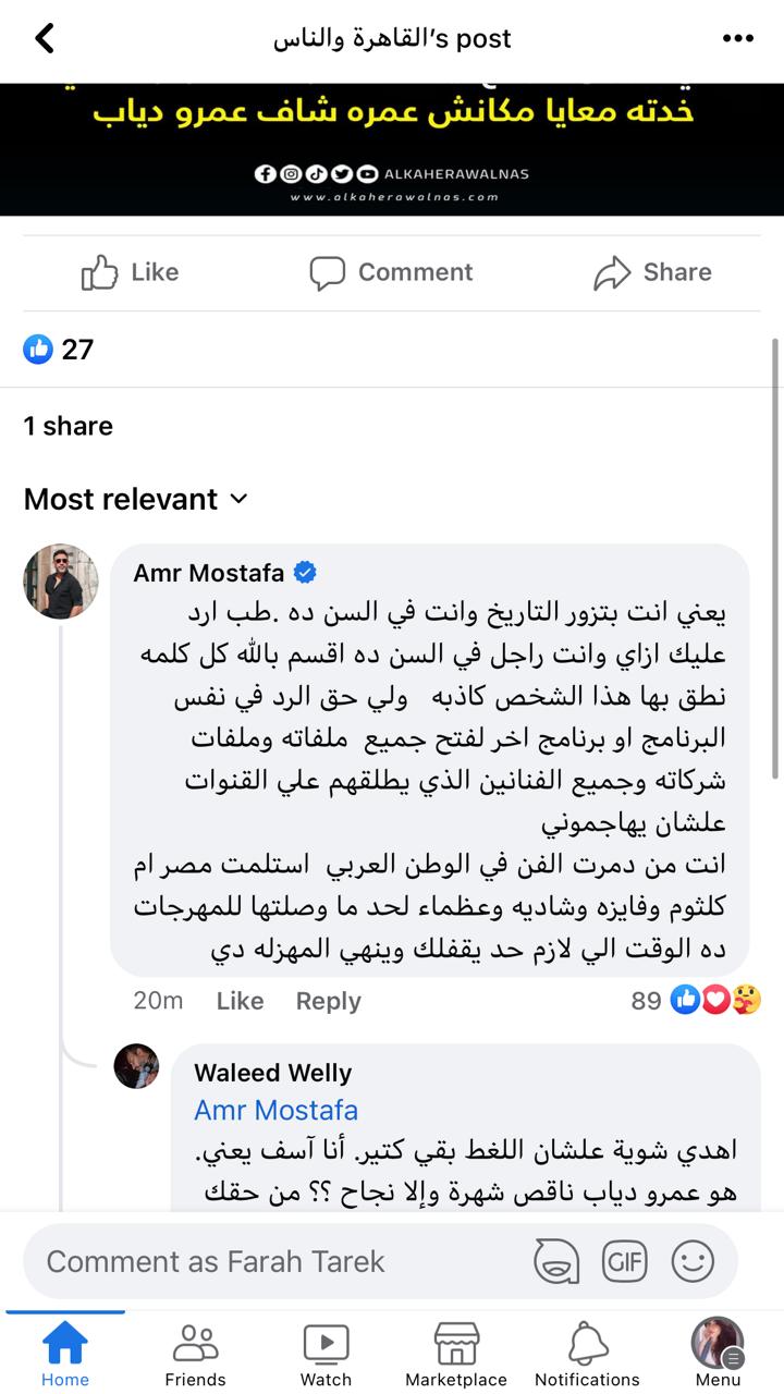 وكتب عمرو مصطفى تعليقًا على تصريحات المنتج محسن جابر خلال استضافته في برنامج حديث القاهرة الذي يقدمه الإعلامي خيري رمضان، على شاشة قناة القاهرة والناس، قائلًا: يعني أنت بتزور التاريخ وأنت في السن ده.. طب أرد عليك إزاي وأنت راجل في السن ده، أقسم بالله كل كلمة نطق بها هذا الشخص كاذبة.. ولي حق الرد في نفس البرنامج أو برنامج آخر لفتح جميع ملفاته وملفات شركاته وجميع الفنانين الذي يطلقهم على القنوات علشان يهاجموني أنت مَن دمرت الفن في الوطن العربي.
