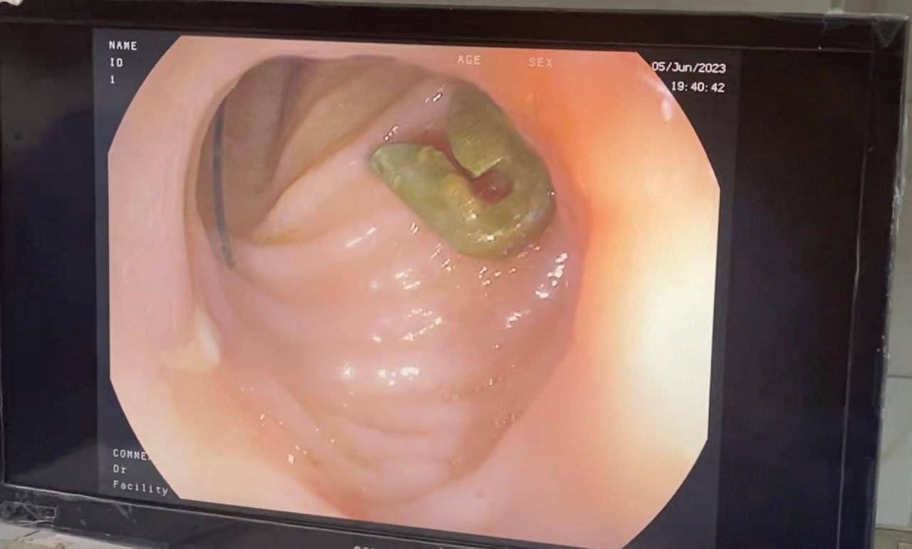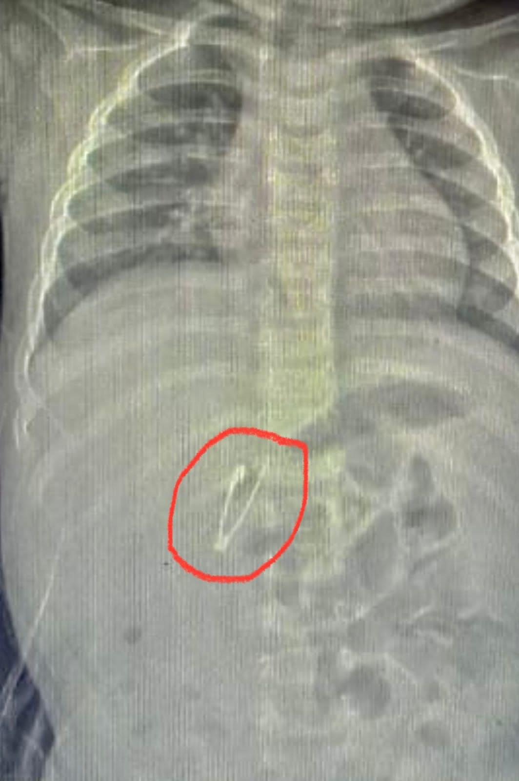 وبينت الأشعة وجود الدبوس في الجزء الأول من الاثني عشر وانغرس طرف الدبوس المدبب فى جدار الأمعاء ولم يكن هناك حلول مطروحة سوى استخراجه عن طريق المنظار والذي يحتاج إلى مهارة عالية جدا، نظرا لأن عمر الطفل 7 أشهر فقط.