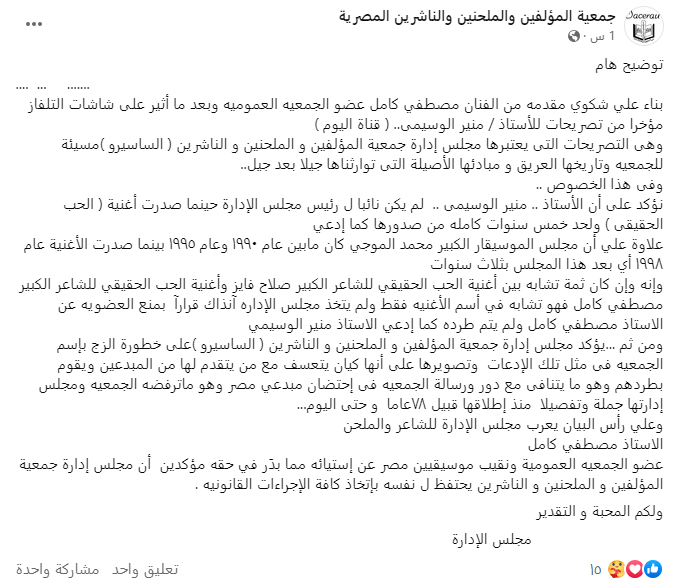 ونشرت جمعية المؤلفين والملحنين، البيان عبر حسابها الرسمي بموقع فيس بوك والذي جاء كالتالي: بناء على شكوى مقدمة من الفنان مصطفى كامل عضو الجمعية العمومية، وبعد ما أثير على شاشات التلفاز مؤخرا من تصريحات للأستاذ منير الوسيمي قناة اليوم، وهي التصريحات التي يعتبرها مجلس إدارة جمعية المؤلفين والملحنين والناشرين الساسيرو، مسيئة للجمعية وتاريخها العريق ومبادئها الأصيلة التي توارثناها جيلا بعد جيل.