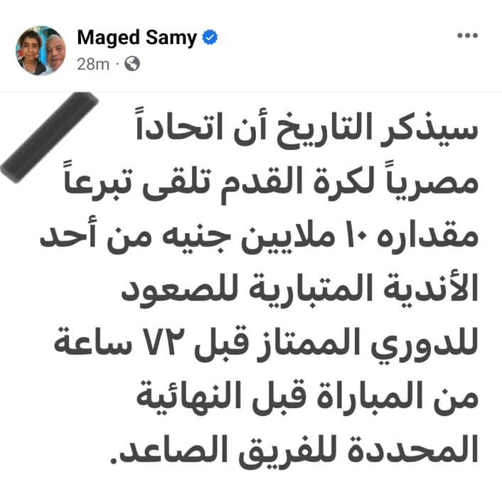 تحدث ماجد سامي رئيس نادي دجلة في منشور عبر حسابه الشخصي بموقع التواصل الاجتماعي فيس بوك، عن تلقي اتحاد الكرة تبرعًا من أحد الأندية في دوري الدرجة الثانية قبل نهاية الدوري بجولتين.