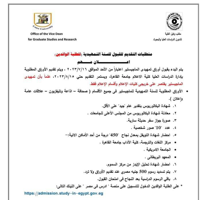 إعلام القاهرة تعلن شروط التقديم لتمهيدي الماجستير للطلاب الوافدين
