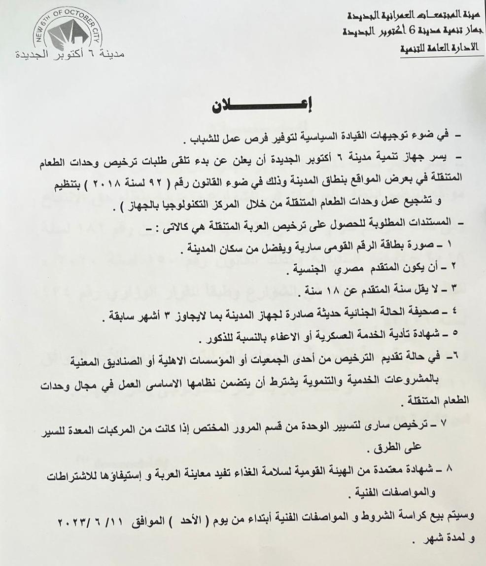 قرر جهاز تنمية مدينة 6 أكتوبر الجديدة، إتاحة التقديم على وحدات الطعام المتنقلة في أحد المواقع بنطاق المدينة وتحديدا بمنطقة ربوة أكتوبر، وسيتم بيع كراسة الشروط والموصفات الفنية ابتداءً من يوم الأحد 11-6-2023 ولمدة شهر.