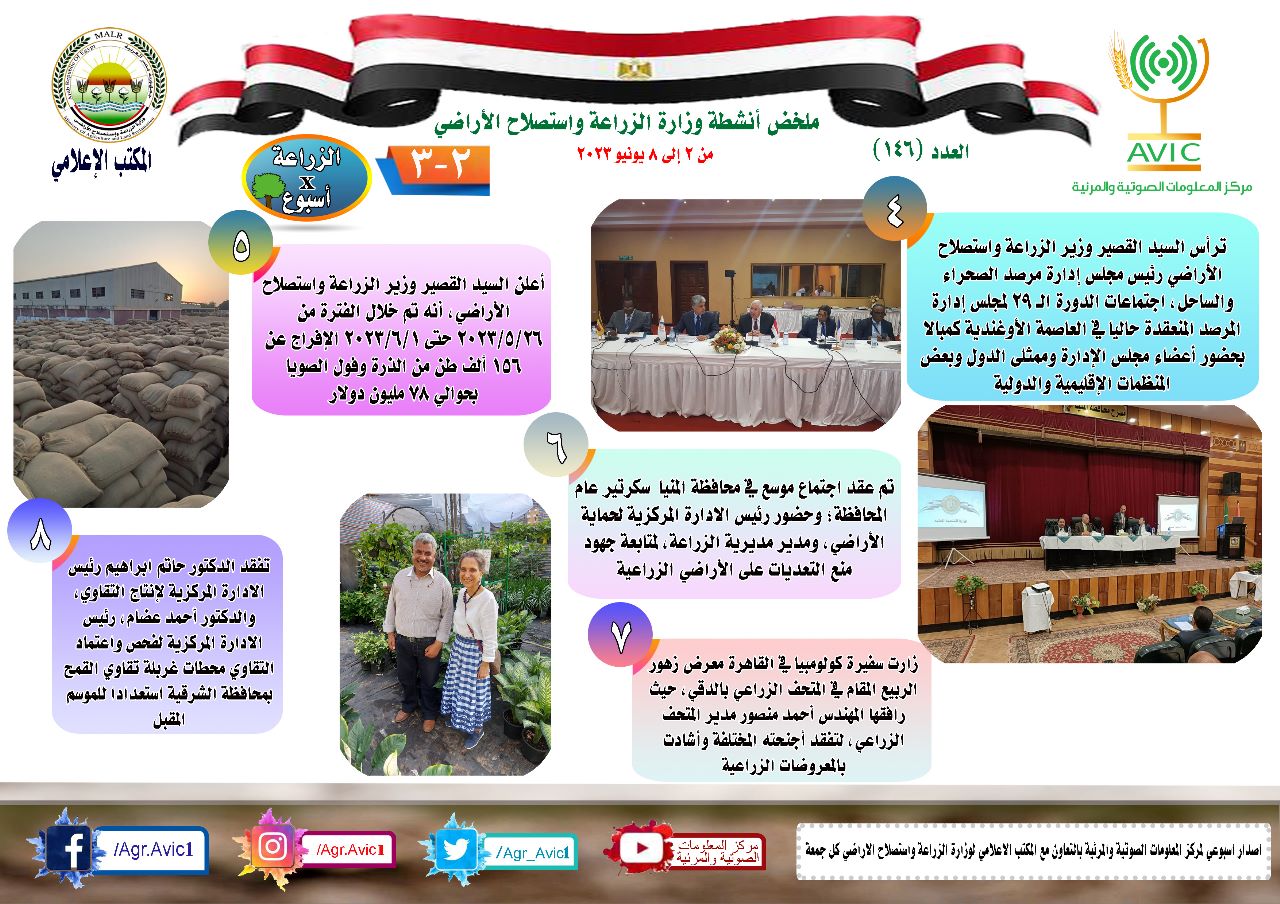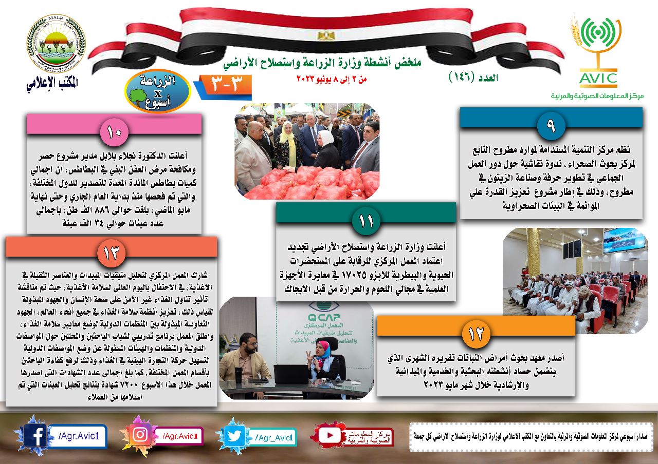 أصدر مركز المعلومات الصوتية والمرئية، التابع لوزارة الزراعة واستصلاح الأراضي، الانفوجراف الأسبوعي، في نسخته رقم 146، حول الحصاد الأسبوعي لأهم أنشطة الوزارة، خلال الأسبوع الماضي خلال الفترة من 2 وحتى 8 يونيو الجاري، وذلك بالتعاون مع المكتب الإعلامي للوزارة.