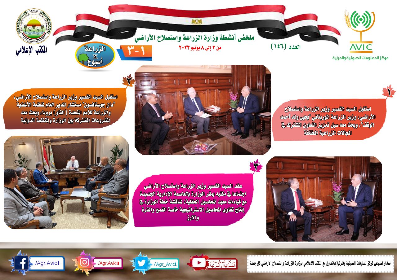 وخلال هذا الأسبوع استقبل السيد القصير وزير الزراعة واستصلاح الأراضي، وزير الزراعة الموريتاني يحيى ولد أحمد الوقف، وبحث معه سبل تعزيز التعاون المشترك في المجالات الزراعية المختلفة، كما استقبل أيضا دان جوستافسون، مستشار المدير العام لمنظمة الأغذية والزراعة للأمم المتحدة (الفاو) بروما، وبحث معه المشروعات المشتركة بين الوزارة والمنظمة الدولية.