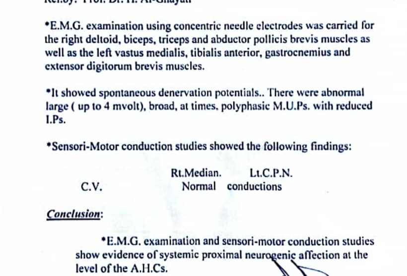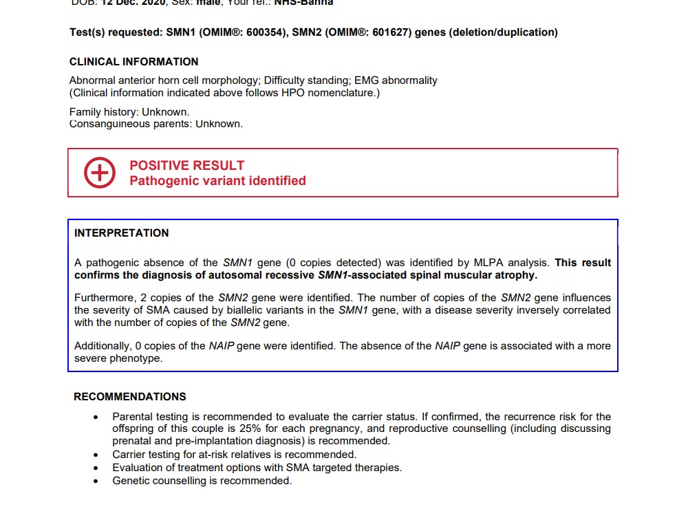 يبلغ زين الآن عامين ونصف، وشُخص بمرض الضمور الشوكي من النوع الثاني، وهي حالة أقل حدة من النوع الأول، ويكون الطفل في هذه الحالة قادرًا على الجلوس دون مساعدة، لكنه يعجز عن المشي أو الوقوف، ويعاني من ضعف في عضلات الذراع، وعضلات التنفس، ورعشة في الأطراف.