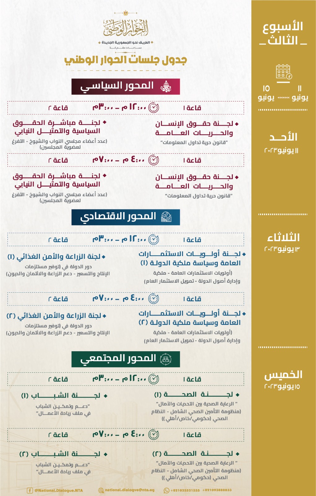 وفى هذا الصدد، أعلنت إدارة الحوار الوطني، استئناف جلسات الأسبوع الثالث، وذلك بعد انتهاء جلسات الأسبوع الأول والثاني والتي استغرقت قرابة الـ 51 ساعة انعقاد؛ للتوافق حول قضايا شكّلت أولويات هامة لدى المواطنين.
