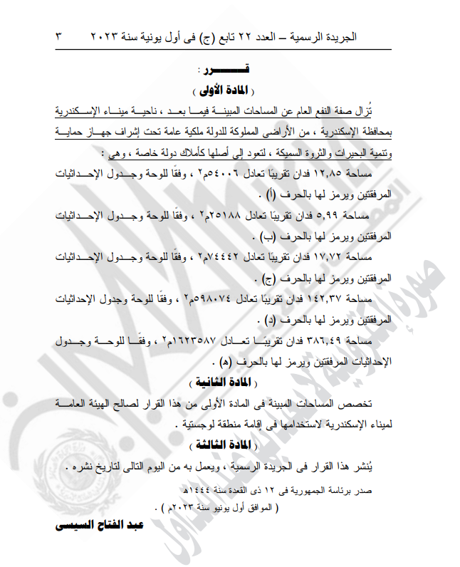 ونص القرار الرئاسى رقم 227 لسنة 2023 فى مادته الأولى، على أن تزال صفة النفع العام عن المساحات المبينة فيما بعد، ناحية ميناء الإسكندرية بمحافظة الإسكندرية، من الأراضي المملوكة للدولة ملكية عامة تحت إشراف جهاز حماية وتنمية البحيرات والثروة السميكة، لتعود إلى أصلها كأملاك دولة خاصة، وهي كما يوضحها المستند الآتى: