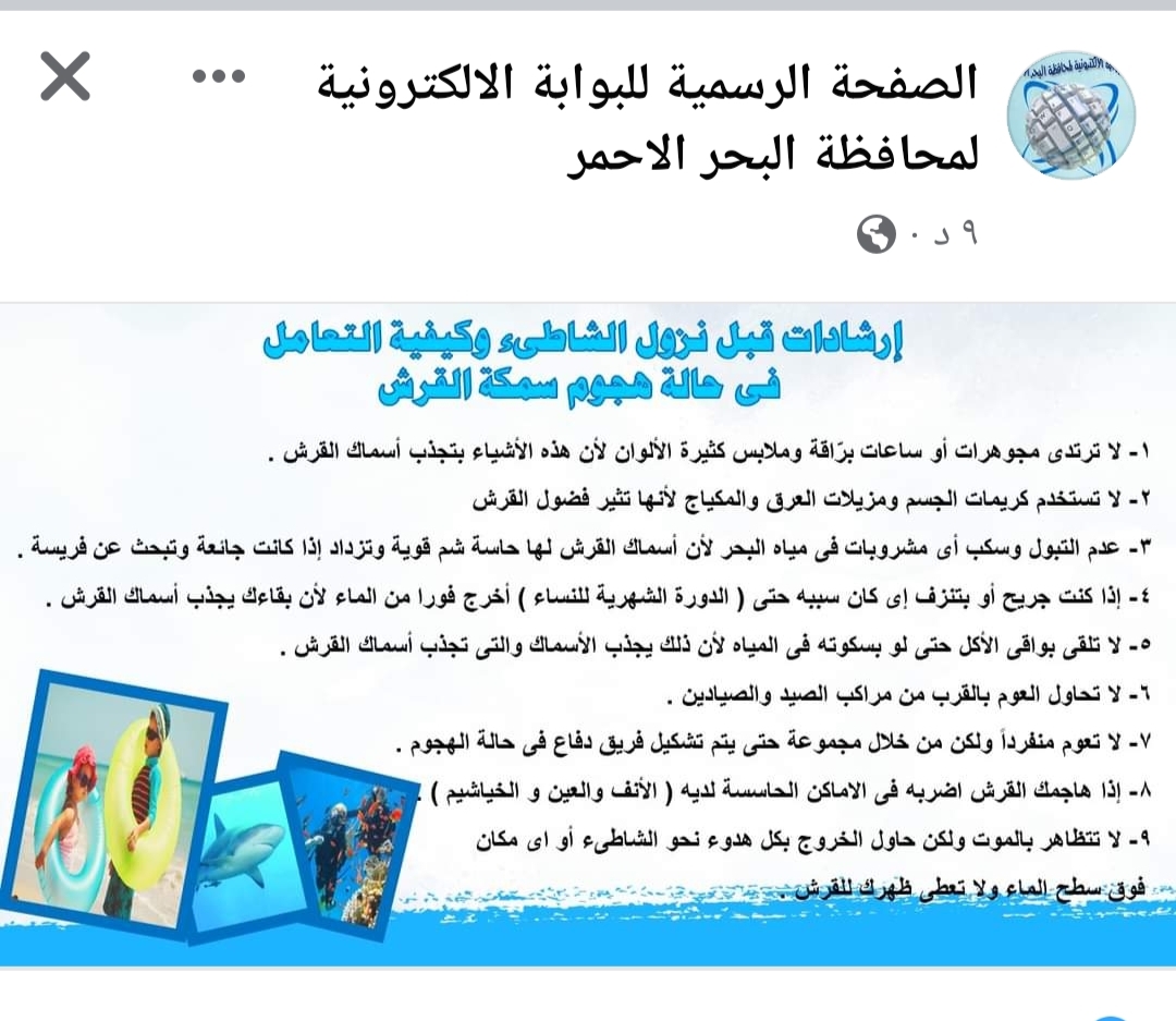 نشرت الصحفة الرسمية لديوان عام محافظة البحر الأحمر، اليوم الاثنين، عدة إرشادات لرواد الشواطئ بعد حادث هجوم القرش خلال الأيام الماضية.