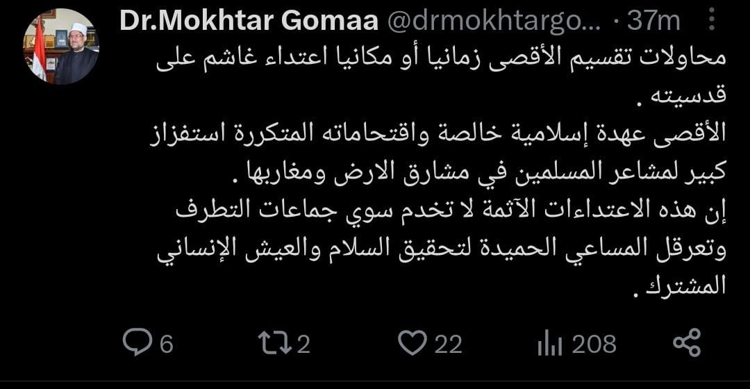 قال الدكتور محمد مختار جمعة، وزير الأوقاف، إن محاولات تقسيم الأقصى زمانيا أو مكانيا اعتداء غاشم على قدسيته، مضيفا أن الأقصى عهدة إسلامية خالصة واقتحاماته المتكررة استفزاز كبير لمشاعر المسلمين في مشارق الأرض ومغاربها.